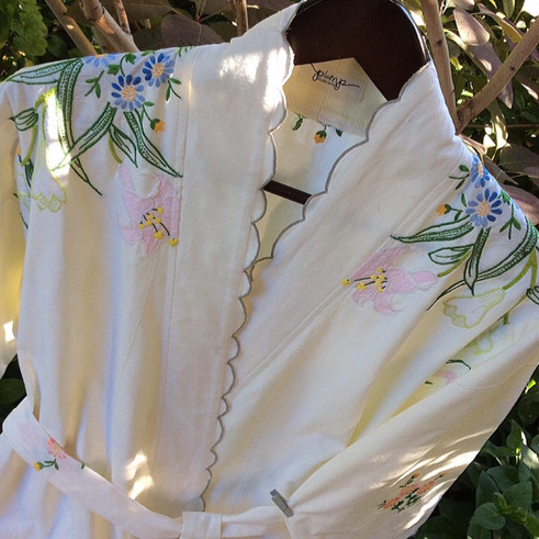 Lighter weight robes are created from vintage hand embroidered linen or cotton tablecloths of natural fibres so they breathe. Also vintage sheeting of quality repurposed into handmade robes with a difference.